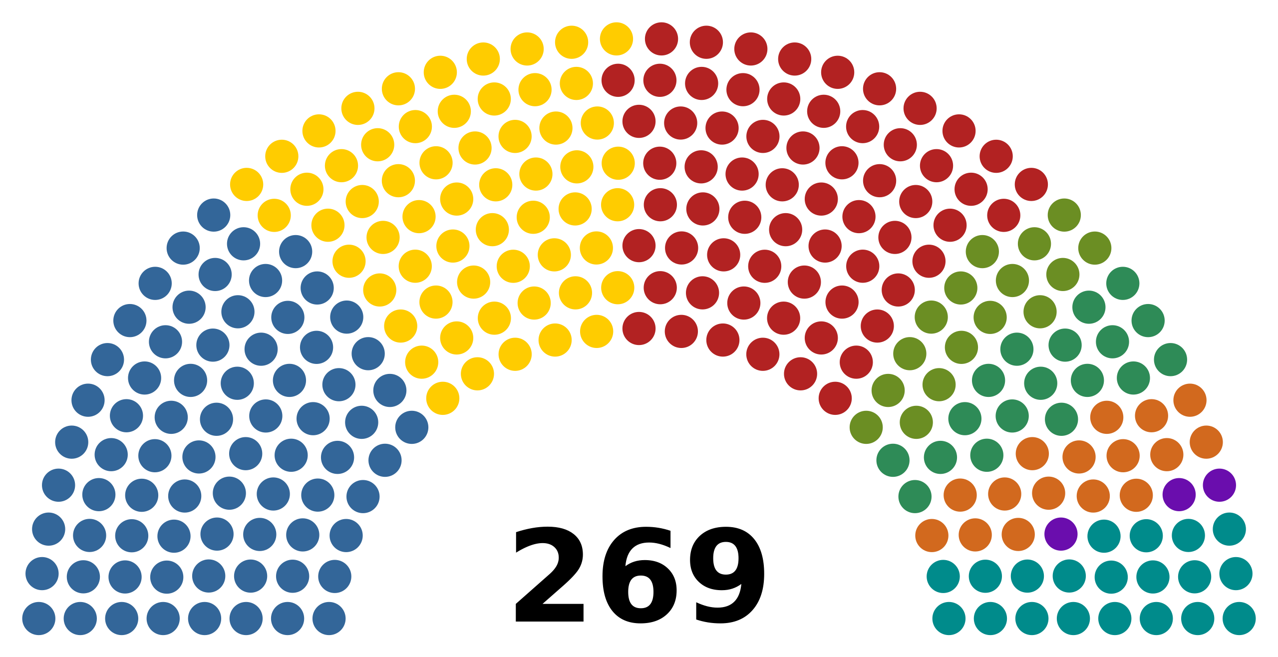 | 01:09, 13 December 2025 | 360 × 185 (11 KB) | Mapping Expert (talk | contribs) | Created using [https://parliamentdiagram.toolforge.org/parlitest.php Parliament diagram tool]. {{legend|#336699|Partido del Orden y la Custodia: 54 seats}} {{legend|#FFCC00|Unión Liberal Platina: 41 seats}} {{legend|#B22222|Movimiento Social Platinense: 46 seats}} {{legend|#6B8E23|Democracia Comunitaria de las Provincias: 14 seats}} {{legend|#2E8B57|Alianza Verde y del Territorio: 10 seats}} {{legend|#D2691E|Liga del Trabajo y la Producción: 7 seats}} {{legend|#6A0DAD|Frente Republicano Lai... |