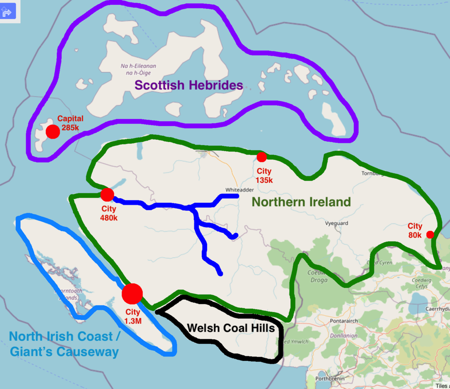 Broadly speaking the territory would be based off of parts of Britain outside of England. North Ireland would be the core geological reference, with relatively low rolling, mostly agricultural and forested terrain with some larger hills (mirroring the apparent topography of neighboring Tircambry) with a healthy smattering of bogs and smaller lakes. The jagged peninsula to the southwest would be modeled on the northern coast of Ireland, specifically the area around Giant's Causeway, to take advantage of the work already done on the coastline. To the east of that peninsula's junction with the mainland would be a hilly area based on the coal mining hills surrounding Cardiff in South Wales. The islands to the north would be inspired by the Hebrides in Scotland and the Aran Islands off the west coast of Ireland. The Baltics (especially Estonia) would also be used as a geographical reference point due to similarities in climate (though would not serve as a cultural influence).