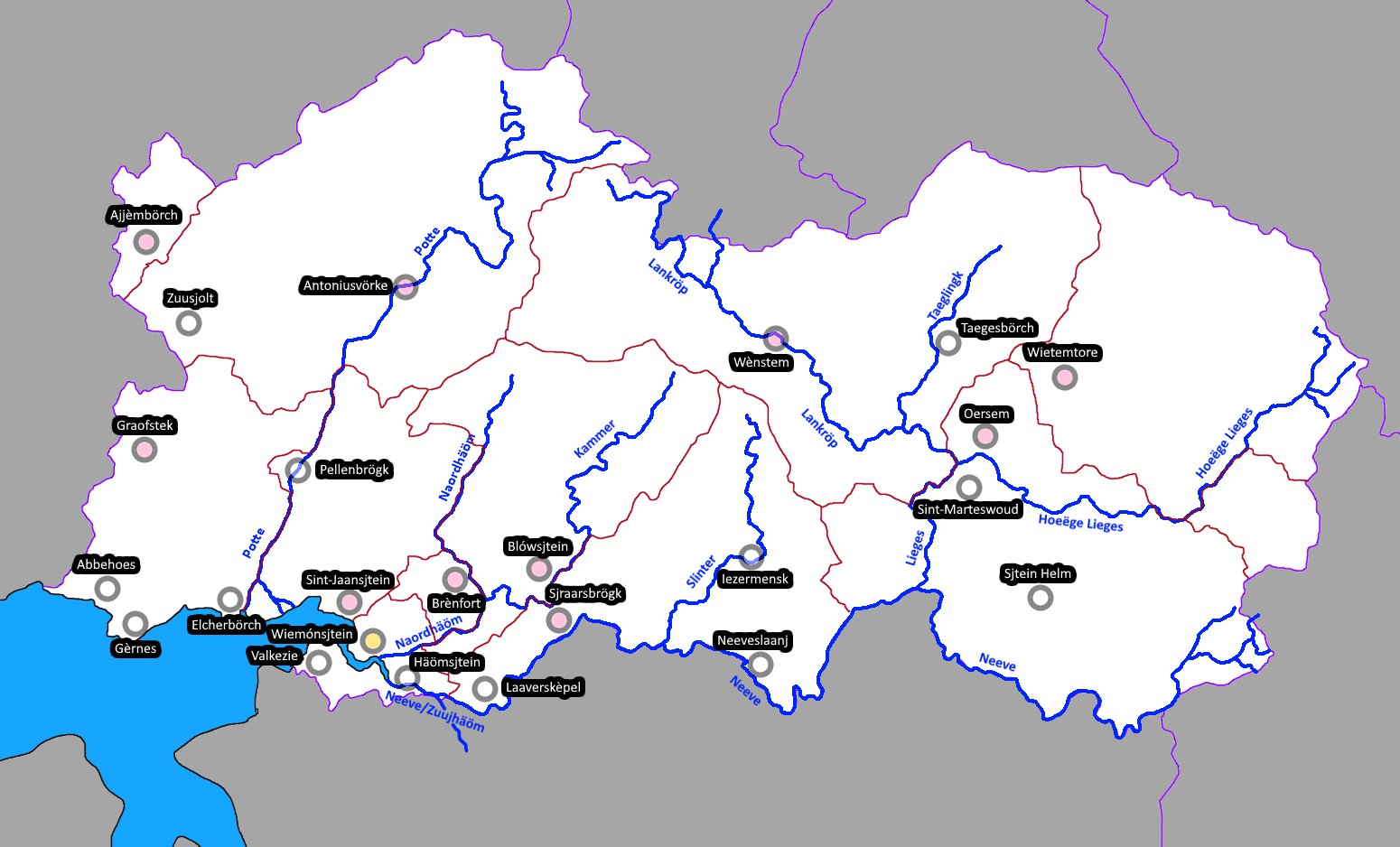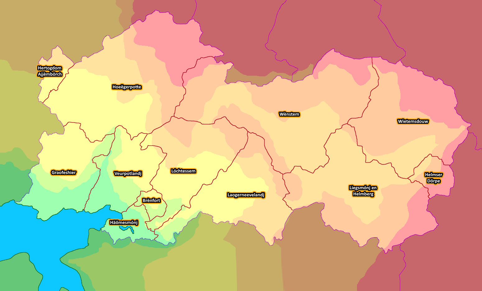 Hemstein's national language is Hemsteiner, which is a fictionalized version of Limburgish in the real world. Limburgish is a dialect spoken in the region around the tripoint of the Netherlands, Germany and Belgium, and especially the provinces of Limburg (NL) and Limburg (BE). A brief look at the Limburgish Wikipedia reveals why I chose for Hemsteiner to be a fictionalized version of the Limburgish language: every single page indicates which subdialect of Limburgish it is written in. Thus, Hemsteiner is my attempt to standardize a language for an independent Limburgish state, with rigidly defined grammar. Additionally, Kalmish is commonly spoken in the eastern few provinces. As a rule of thumb, the chances for someone who speaks Lentian to understand what a Hemsteinian is saying is at its highest around the capital; and gradually decrease the further away one travels; and for someone who speaks Kalmish, it's the inverse. The cities of Brènfort and Zuusjolt both claim that their language is the least influenced by either, and that ''they'' are the ones that speak the true Hemsteiner; although you'll probably find the ''purest Hemsteiner'' is spoken in rural villages anyway, not in the city.