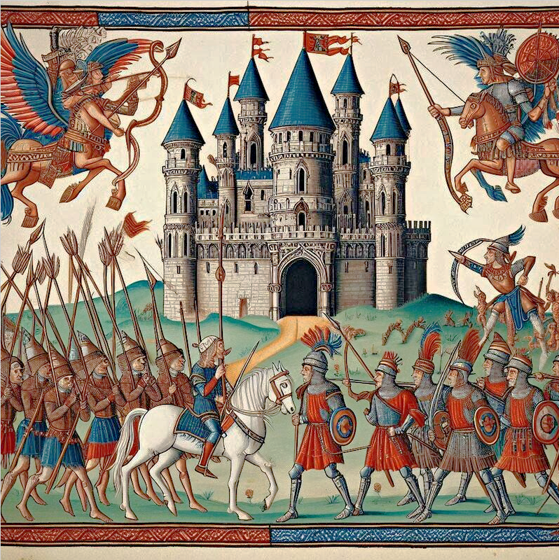 Medieval manuscript image of the Siege of Cornet Castle (Barzona), 1374 produced in a more fantastical style some years after the battle. AI image generate with Microsoft designer: designer.microsoft.com